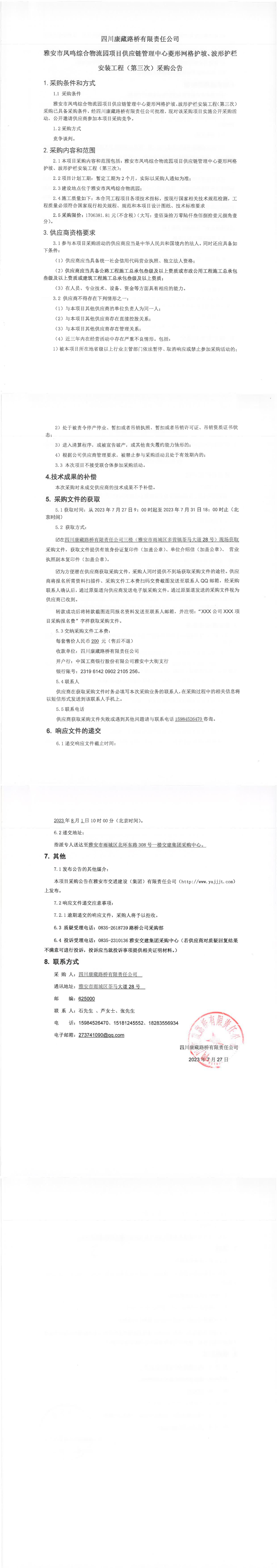 四川康藏路橋有限責任公司雅安市鳳鳴綜合物流園項目供應鏈管理中心菱形網格護坡、波形護欄安裝工程(第三次)采購公告