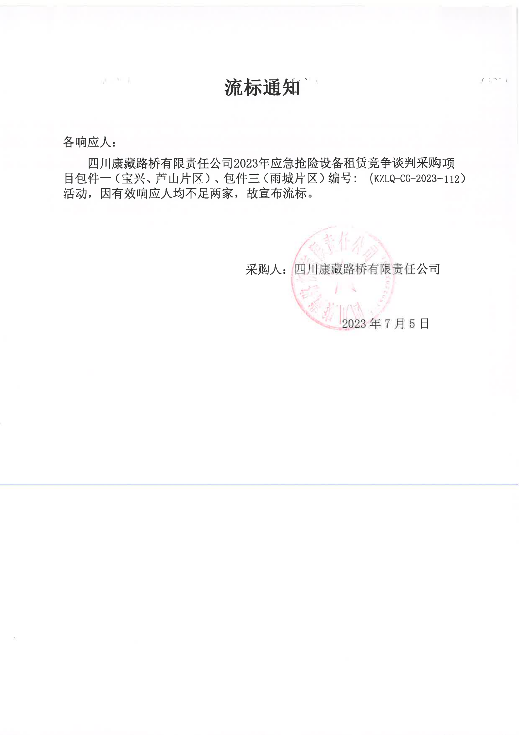 四川康藏路橋有限責(zé)任公司2023年應(yīng)急搶險(xiǎn)設(shè)備租賃競(jìng)爭(zhēng)談判采購(gòu)項(xiàng)目包件一(寶興、蘆山片區(qū))、包件三(雨城片區(qū))流標(biāo)通知