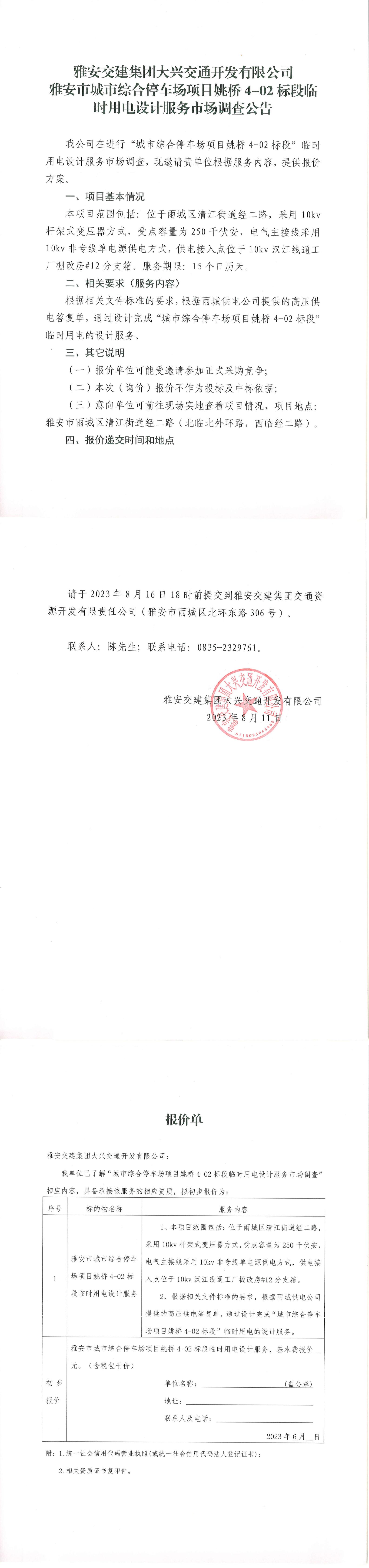 雅安交建集團大興交通開發(fā)有限公司雅安市城市綜合停車場項目姚橋4-02標段臨時用電設(shè)計服務(wù)市場調(diào)查公告