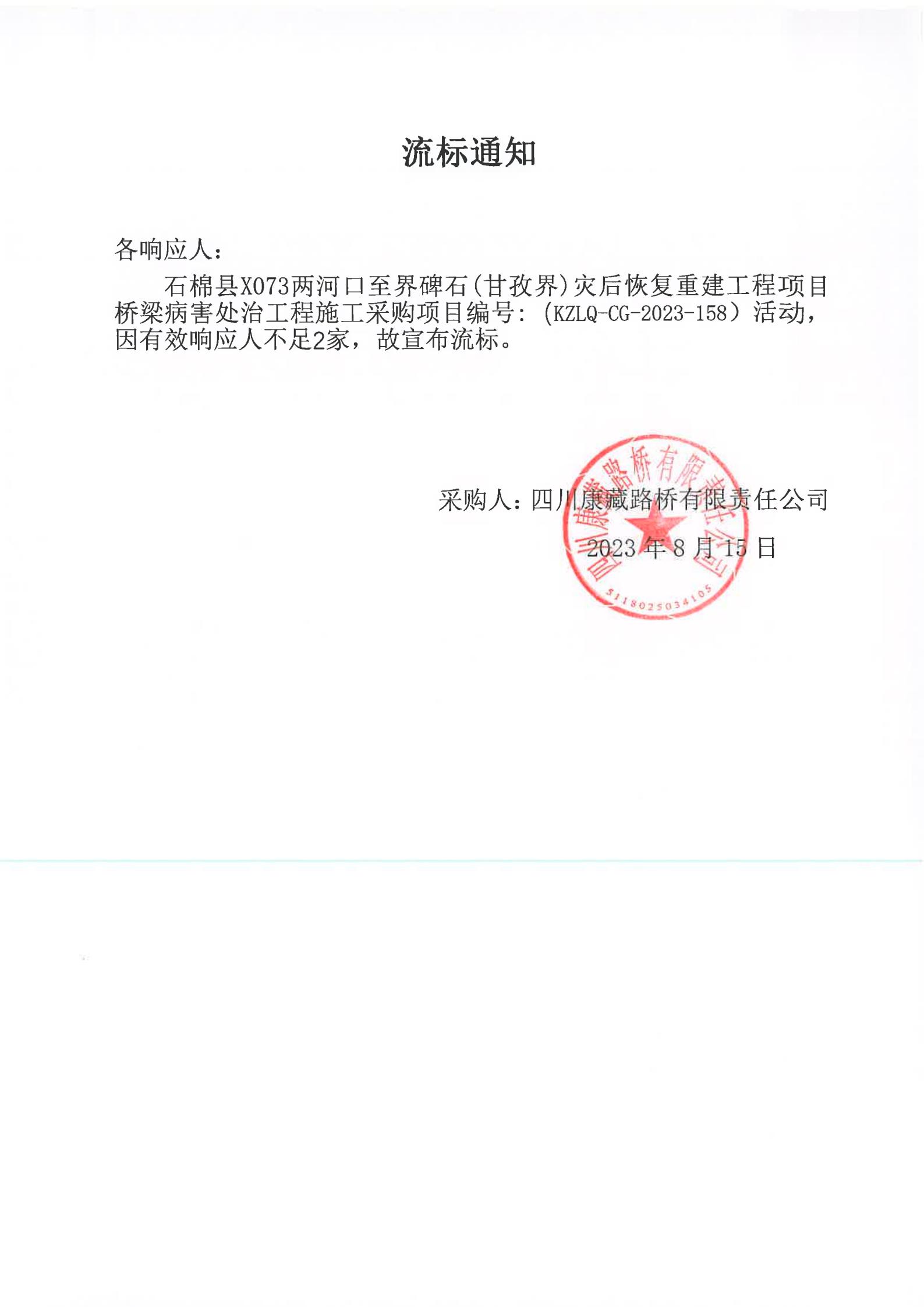 四川康藏路橋有限責(zé)任公司石棉縣X703兩河口至界碑石(甘孜界)災(zāi)后恢復(fù)重建工程項目橋梁病害處治工程施工流標通知