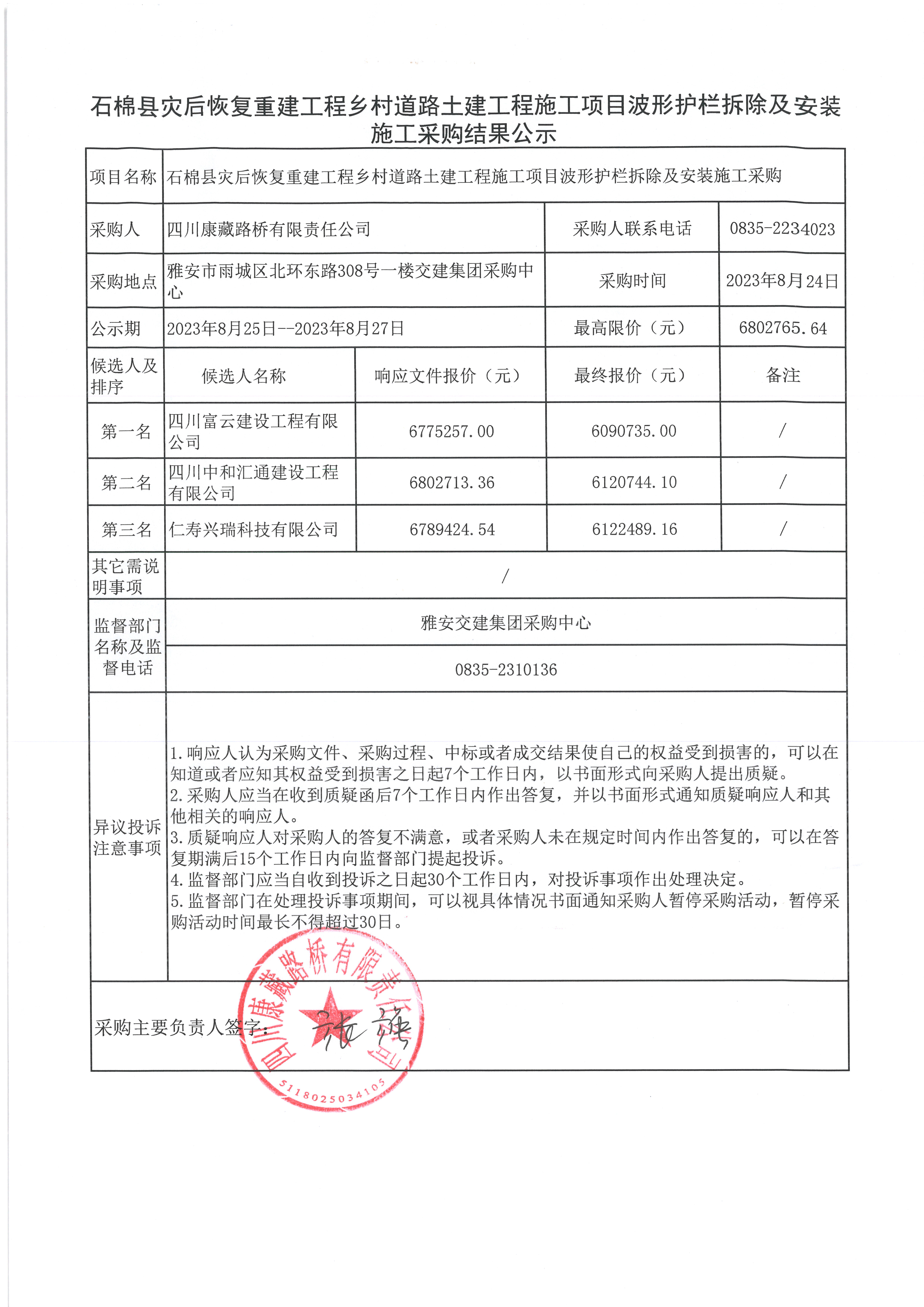 石棉縣災后恢復重建工程鄉(xiāng)村道路土建工程施工項目波形護欄拆除及安裝施工采購結果公示