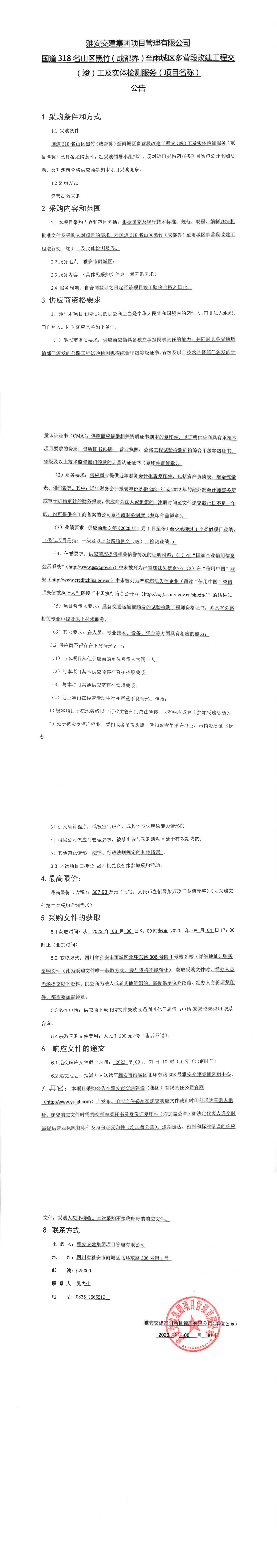雅安交建集團(tuán)項(xiàng)目管理有限公司國道318名山區(qū)黑竹(成都界)至雨城區(qū)多營段改建工程交(竣)工及實(shí)體檢測(cè)服務(wù)(項(xiàng)目名稱)采購公告