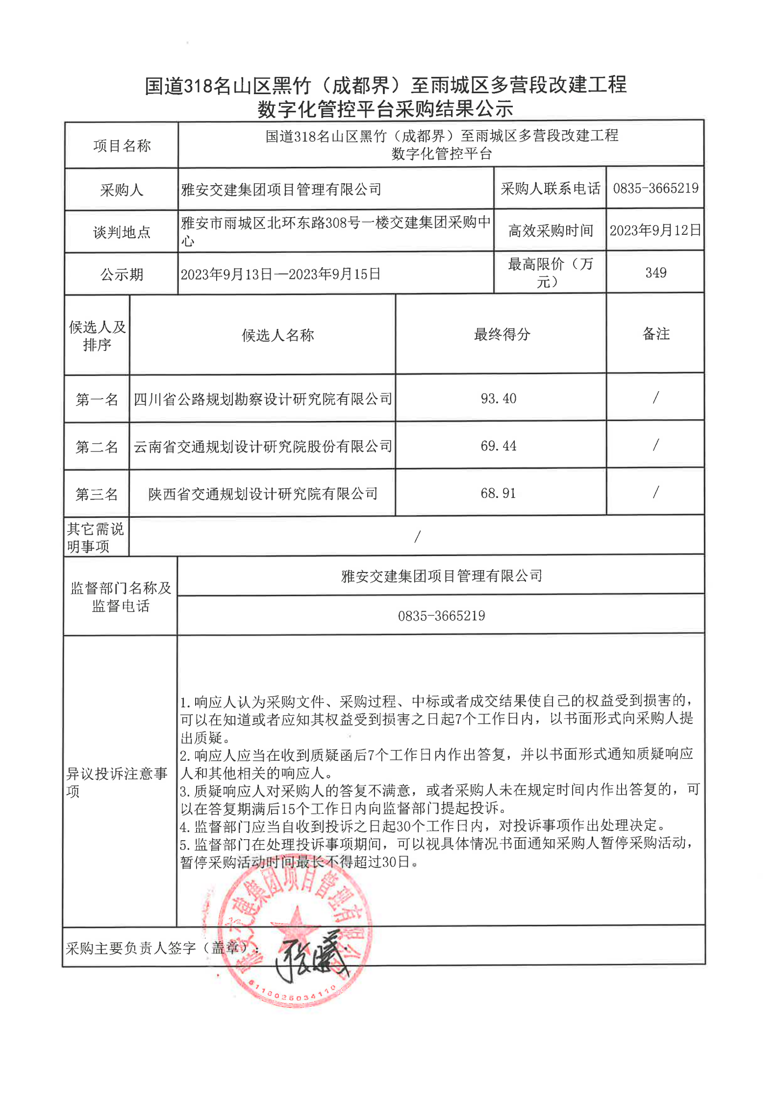 雅安交建集團(tuán)項目管理有限公司國道318名山區(qū)黑竹(成都界)至雨城區(qū)多營段改建工程數(shù)字化管控平臺采購結(jié)果公示