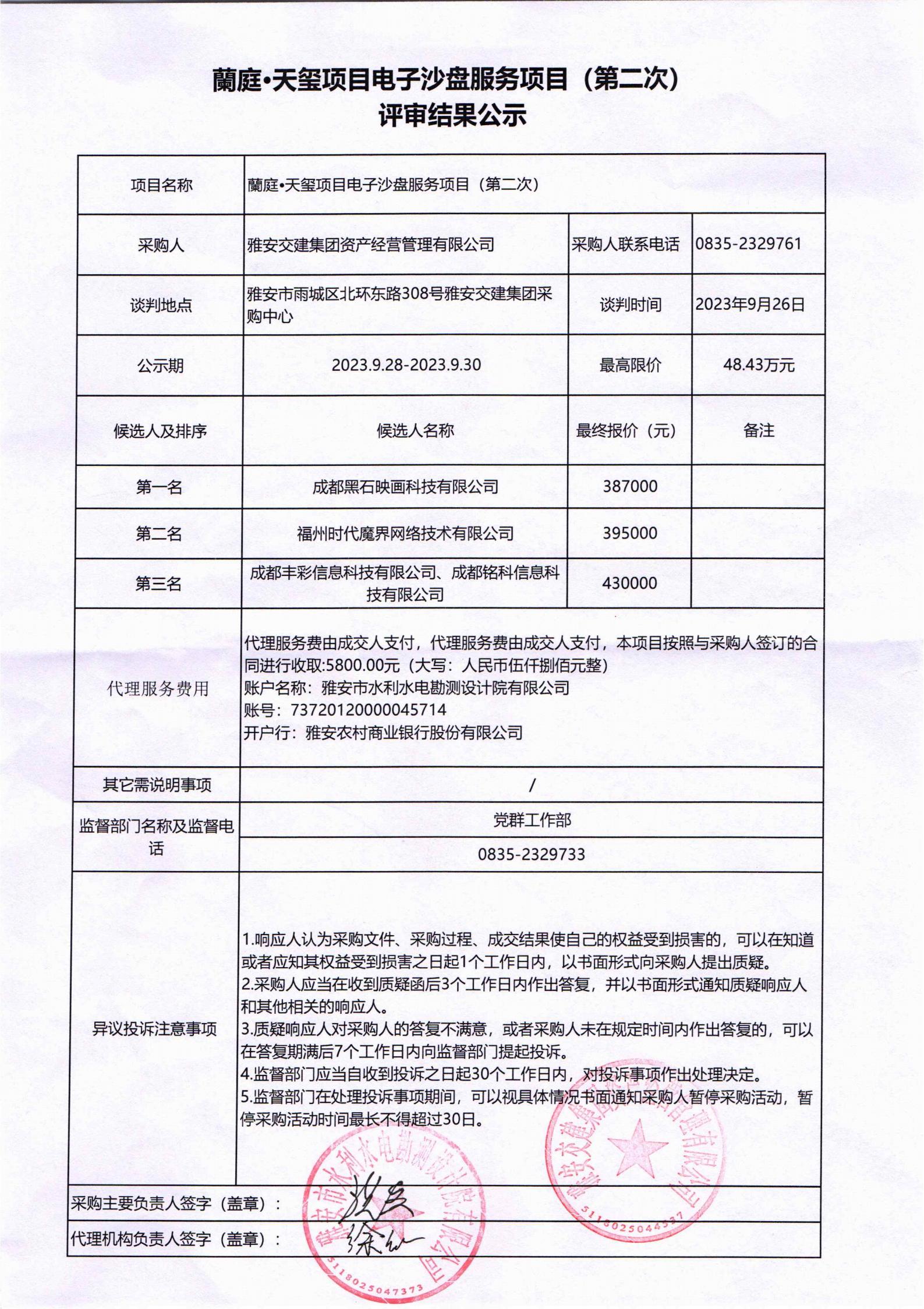 雅安交建集團(tuán)資產(chǎn)經(jīng)營管理有限公司蘭庭•天璽項目電子沙盤服務(wù)項目(第二次)評審結(jié)果公示