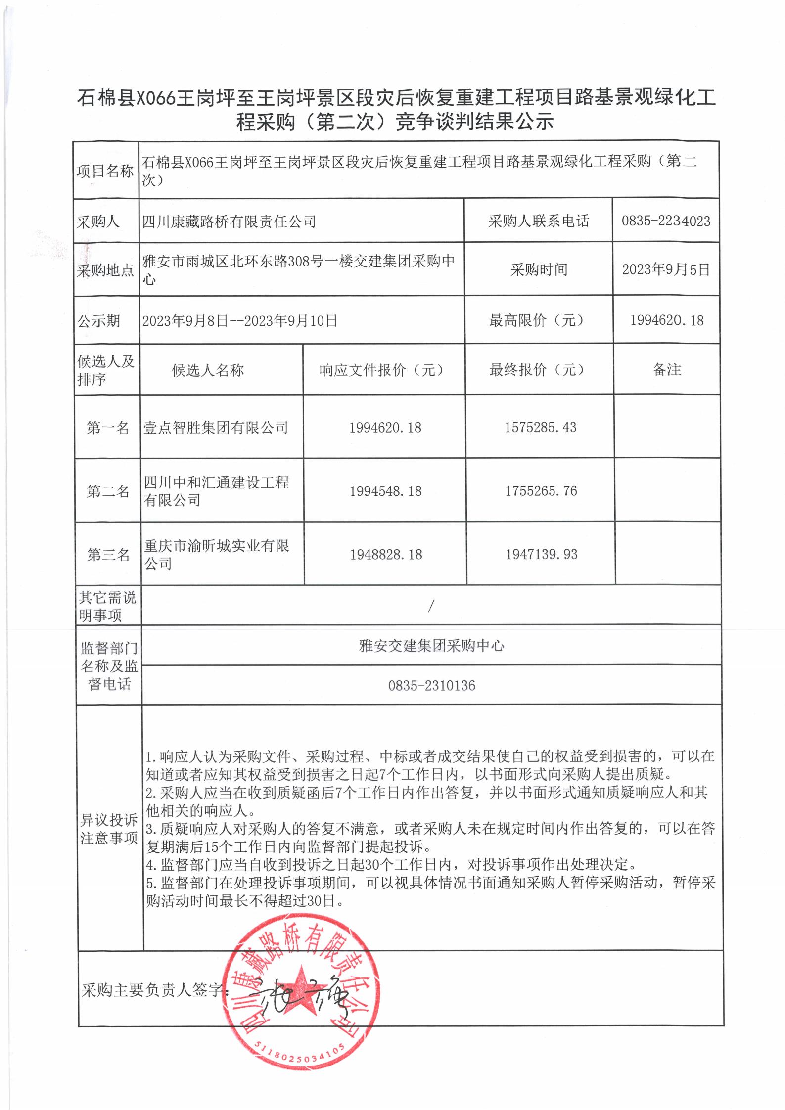 四川康藏路橋有限責任公司石棉縣X066王崗坪至王崗坪景區(qū)段災(zāi)后恢復(fù)重建工程項目路基景觀綠化工程施工采購(第二次)競爭談判結(jié)果公示