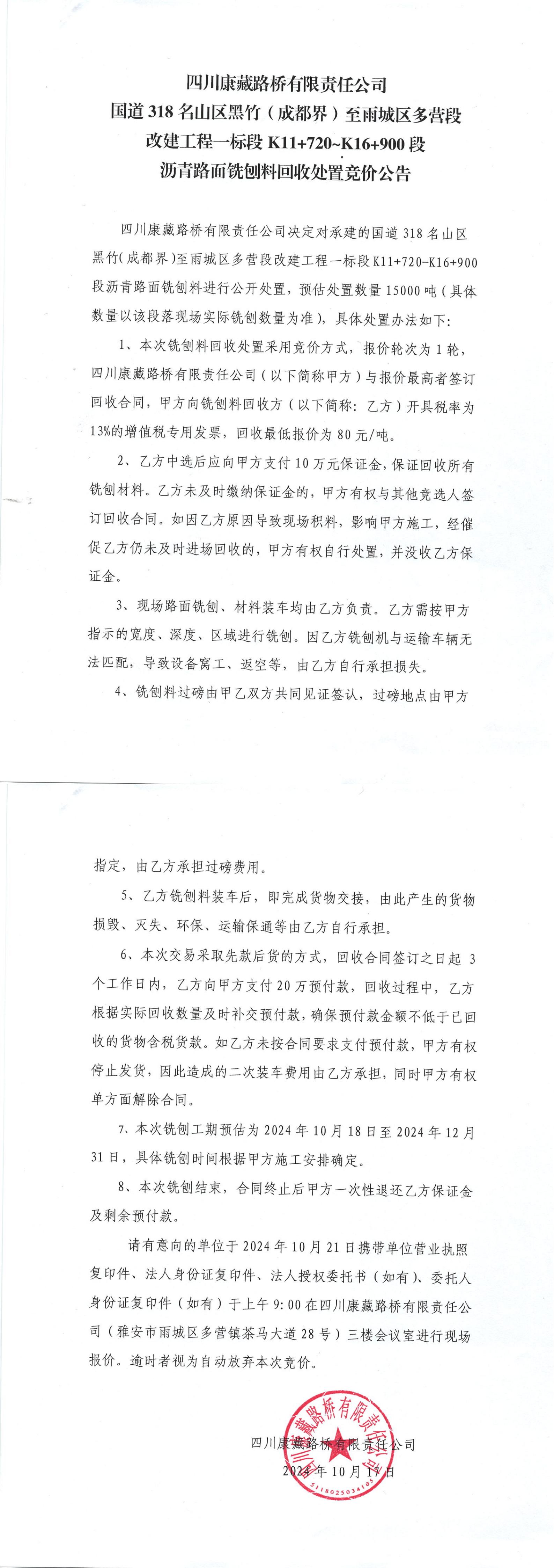 四川康藏路橋有限責(zé)任公司國道318名山區(qū)黑竹(成都界)至雨城區(qū)多營段改建工程一標(biāo)段K11+720—K16+900段瀝青路面銑刨料回收處置競價公告
