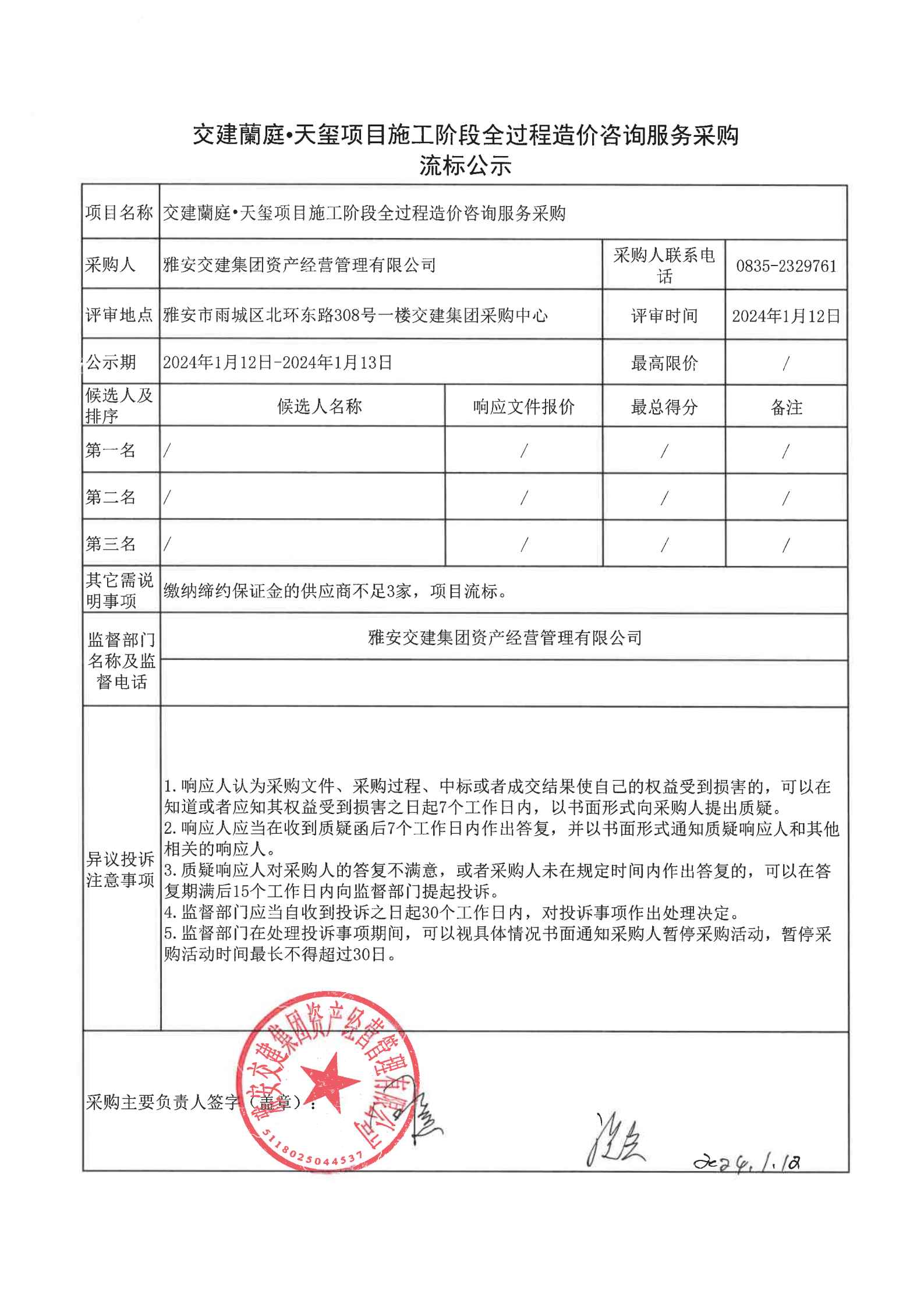 雅安交建集團資產(chǎn)經(jīng)營管理有限公司交建蘭庭·天璽項目施工階段全過程造價咨詢服務(wù)采購流標(biāo)公示