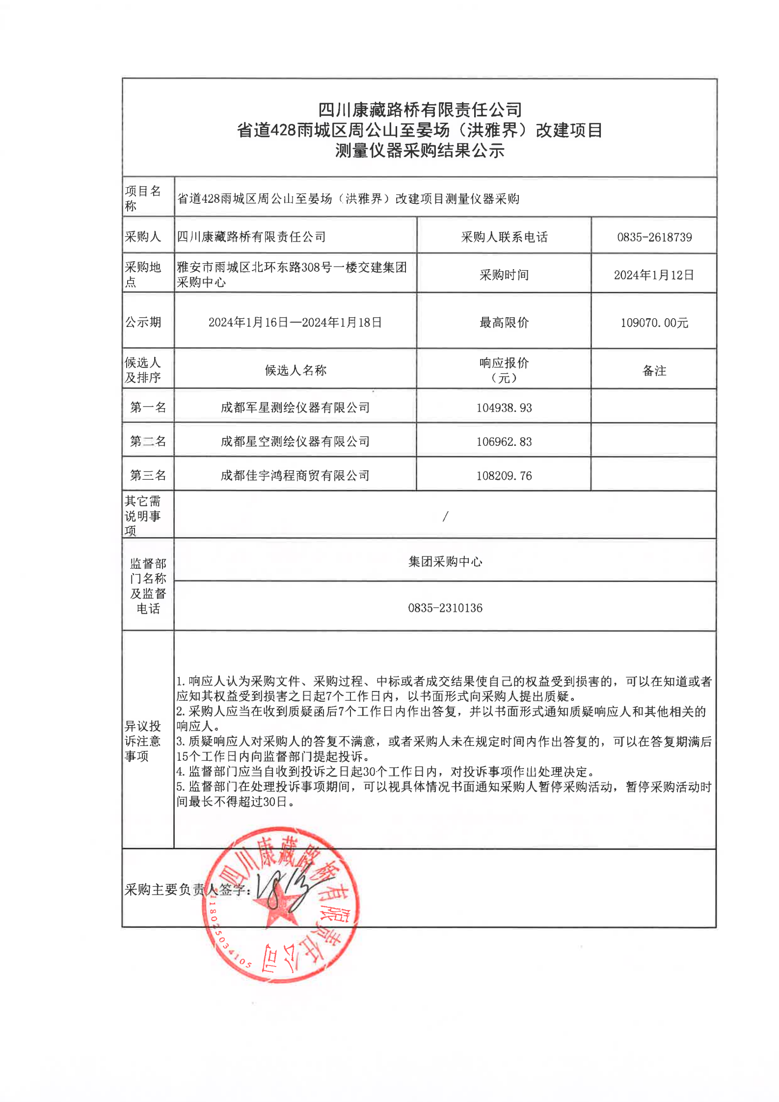四川康藏路橋有限責任公省道428雨城區(qū)周公山至晏場(洪雅界)改建項目測量儀器采購結果公示