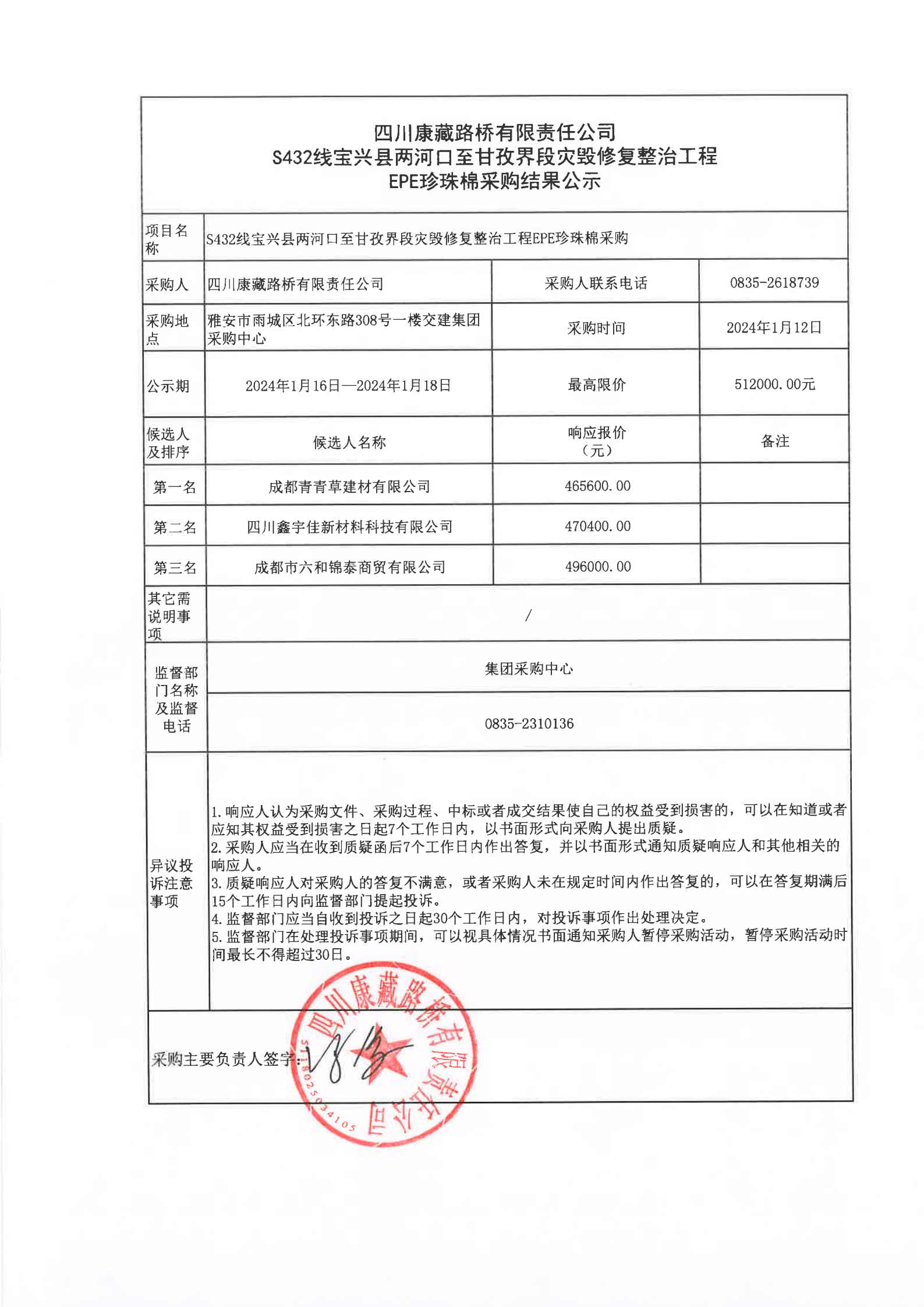 四川康藏路橋有限責任公司S432線寶興縣兩河口至甘孜界段災毀修復整治工程EOE珍珠棉采購結果公示