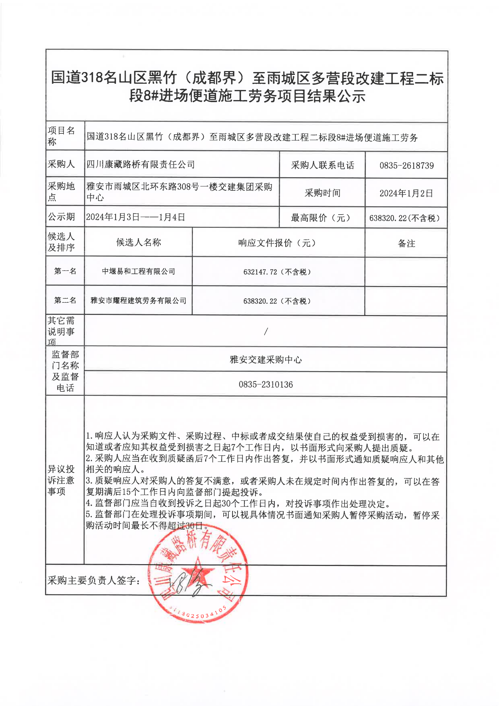 四川康藏路橋有限責(zé)任公司國道318名山區(qū)黑竹(成都界)至雨城區(qū)多營段改建工程二標(biāo)段8#進(jìn)場便道施工勞務(wù)項目結(jié)果公示