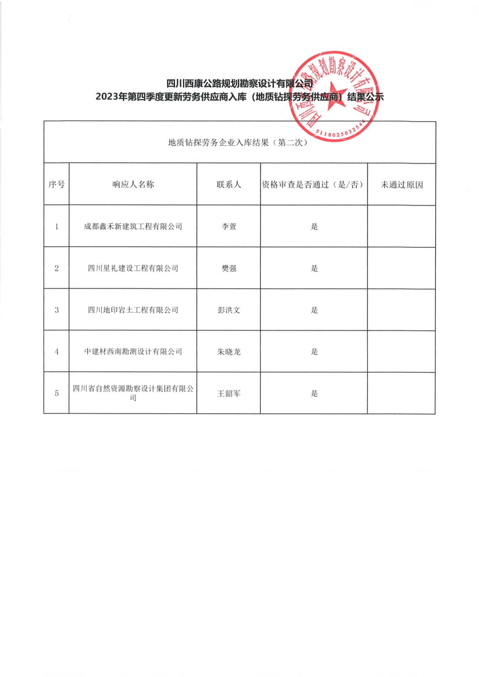 四川西康公路規(guī)劃勘察設計有限公司2023年第四季度更新勞務供應入庫 (地質(zhì)鉆探勞務供應商)結(jié)果公示