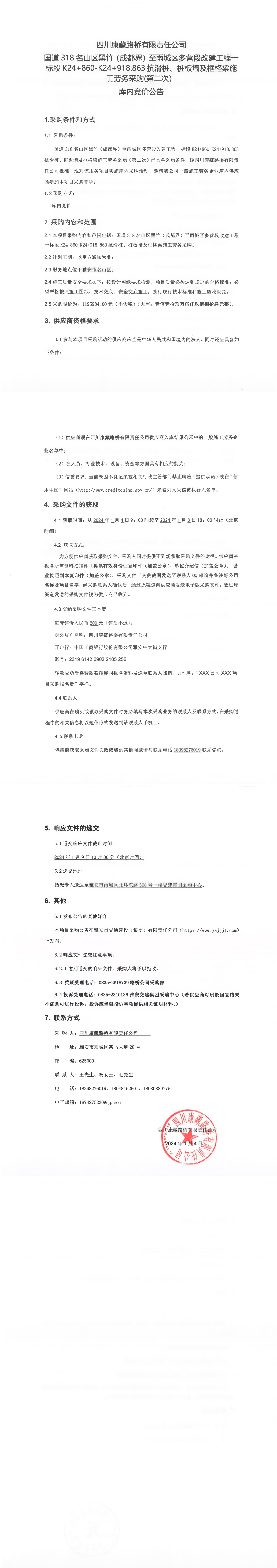 四川康藏路橋有限責任公司國道318名山區(qū)黑竹(成都界)至雨城區(qū)多營段改建工程一標段K24+860-K24+918.863抗滑樁、樁板墻及框格梁施工勞務采購(第二次)庫內(nèi)競價公告