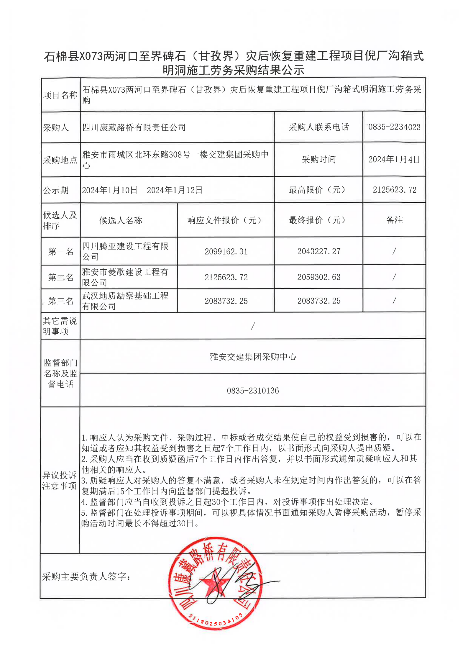 四川康藏路橋有限責(zé)任公司石棉縣X073兩河口至界碑石(甘孜界)災(zāi)后恢復(fù)重建工程項(xiàng)目倪廠溝箱式明洞施工勞務(wù)采購結(jié)果公示
