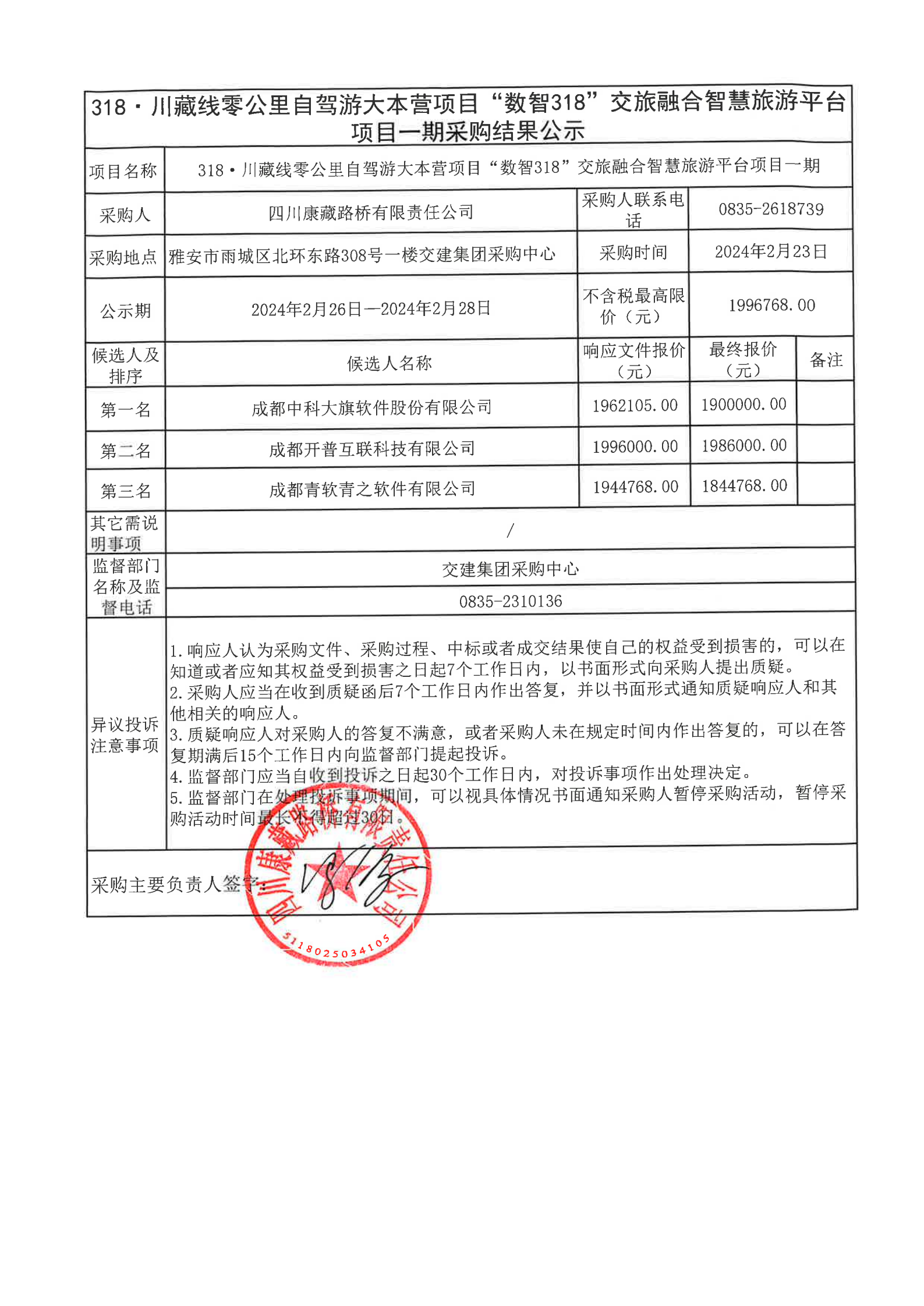 四川康藏路橋有限責(zé)任公司318·川藏公路零公里自駕游大本營(yíng)項(xiàng)目“數(shù)智318”交旅融合智慧旅游平臺(tái)項(xiàng)目一期采購(gòu)結(jié)果公示