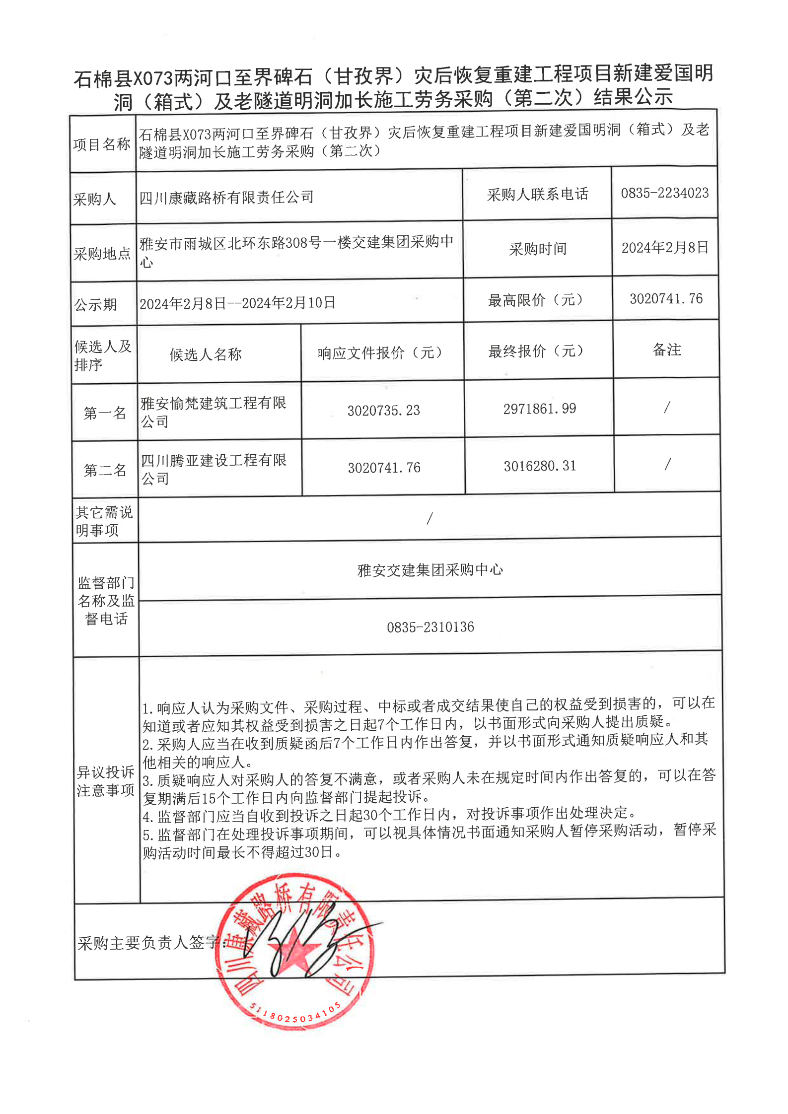 四川康藏路橋有限責(zé)任公司石棉縣X073兩河口至界碑石(甘孜界)災(zāi)后恢復(fù)重建工程項(xiàng)目新建愛國明洞(箱式)及老隧道明洞加長(zhǎng)施工勞務(wù)采購(第二次)結(jié)果公示