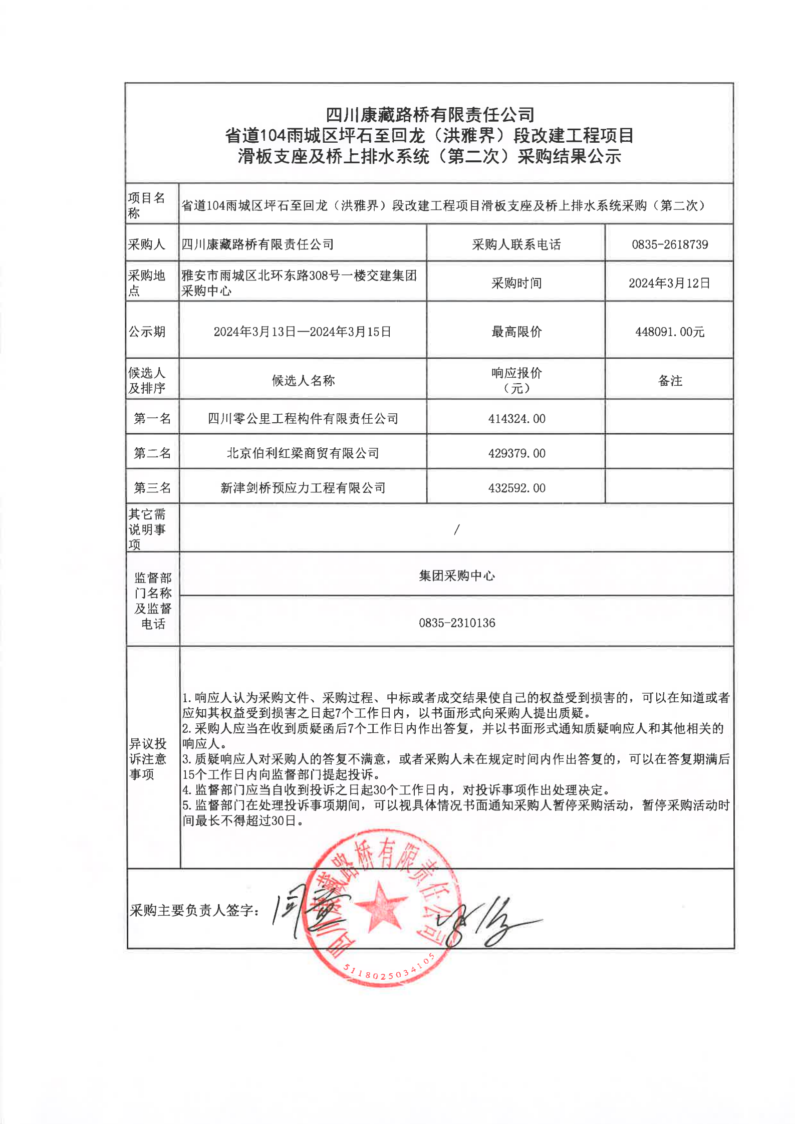 四川康藏路橋有限責(zé)任公司省道104雨城區(qū)坪石至回龍(洪雅界)段改建工程項(xiàng)目滑板支座及橋上排水系統(tǒng)(第二次)采購(gòu)結(jié)果公示