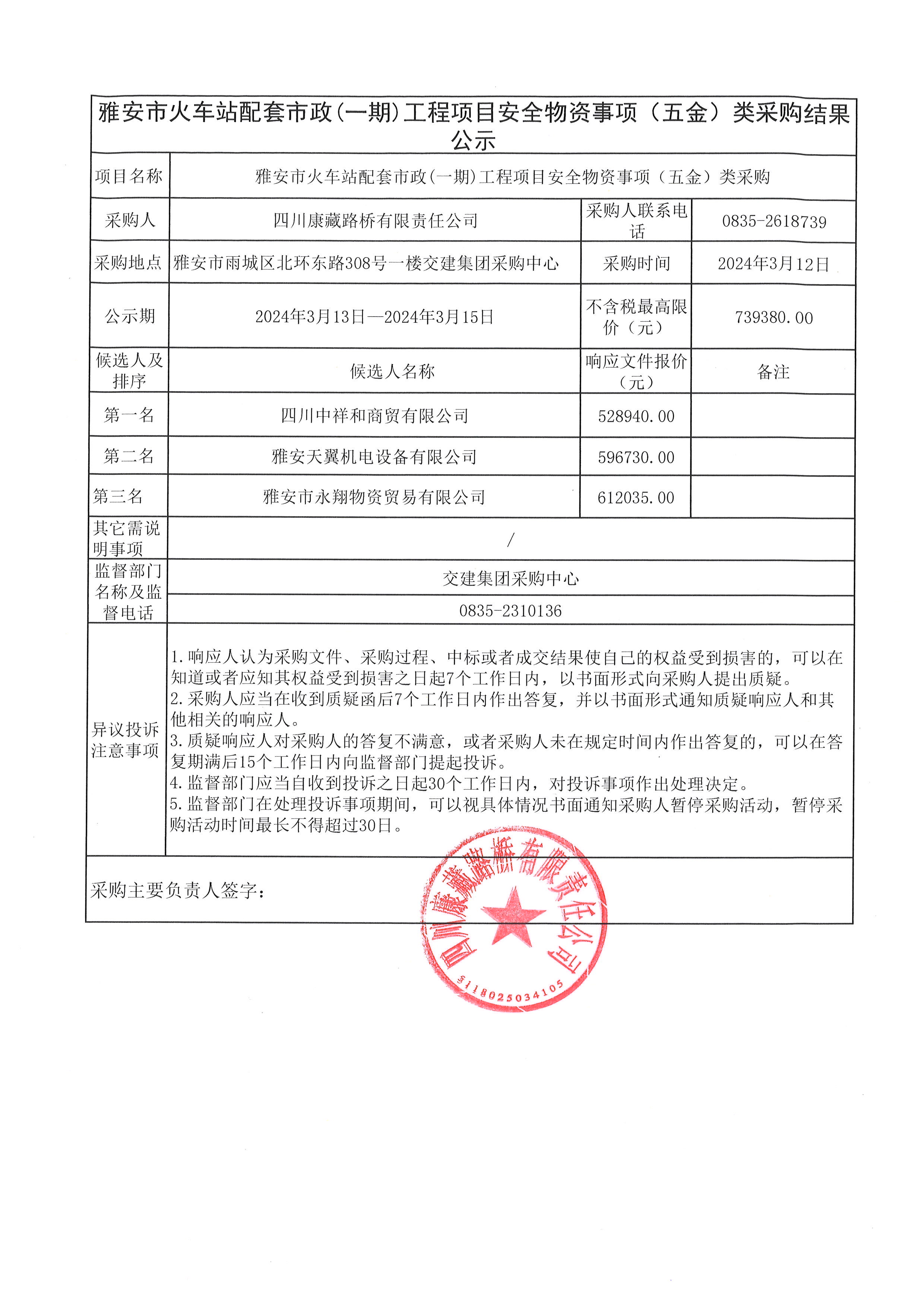 四川康藏路橋有限責任公司雅安市火車站配套市政(一期)工程項目安全物資(五金)采購結果公示