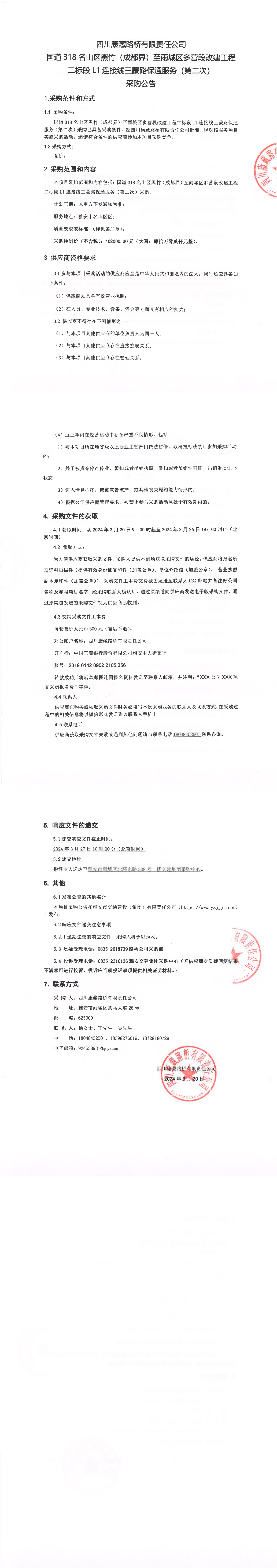 四川康藏路橋有限責任公司國道318名山區(qū)黑竹(成都界)至雨城區(qū)多營段改建工程二標段L1連接線三蒙路保通服務(wù)(第二次)采購公告