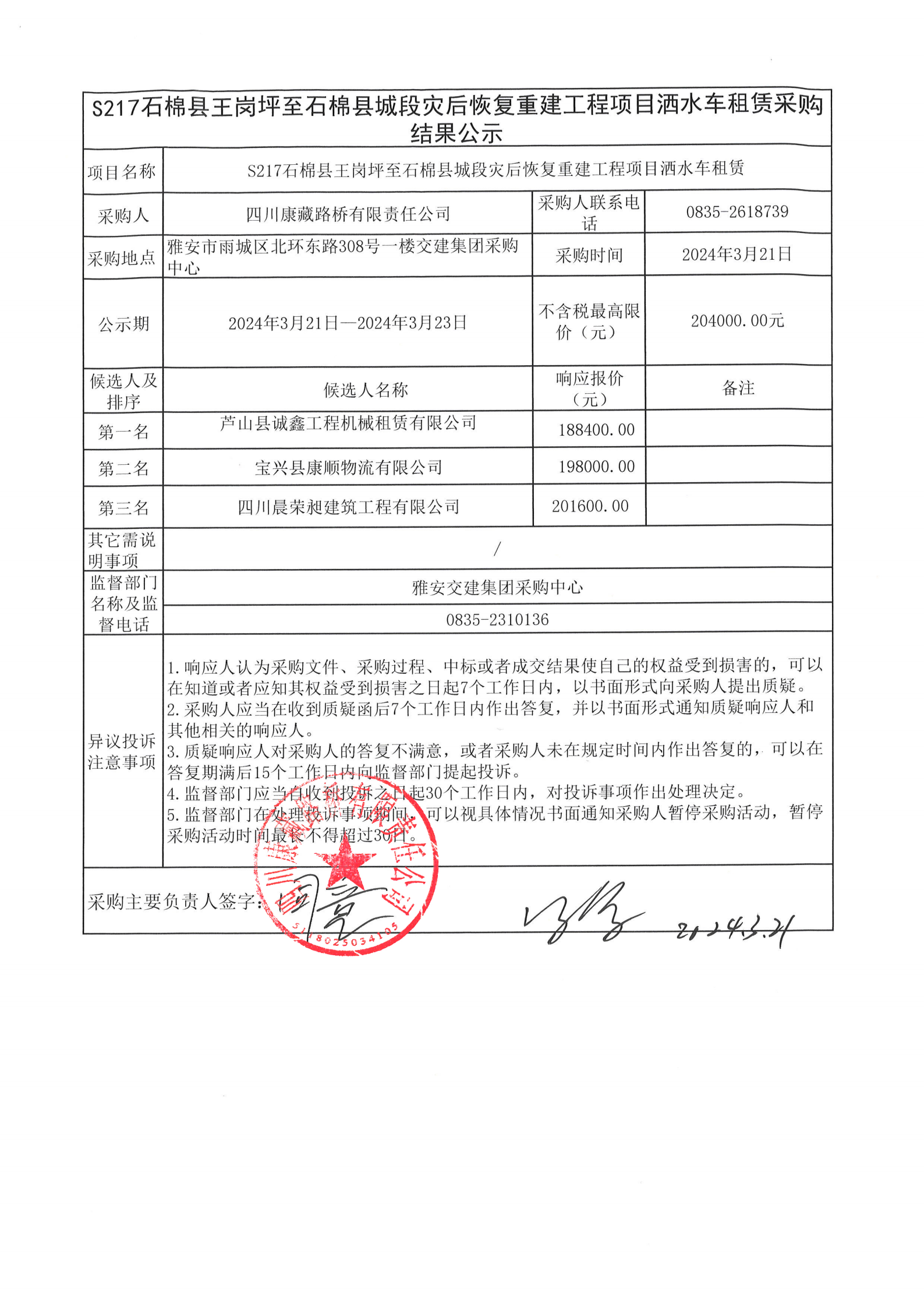 四川康藏路橋有限責(zé)任公司S217石棉縣王崗坪至石棉縣城段災(zāi)后恢復(fù)重建工程項(xiàng)目灑水車租賃采購結(jié)果公示