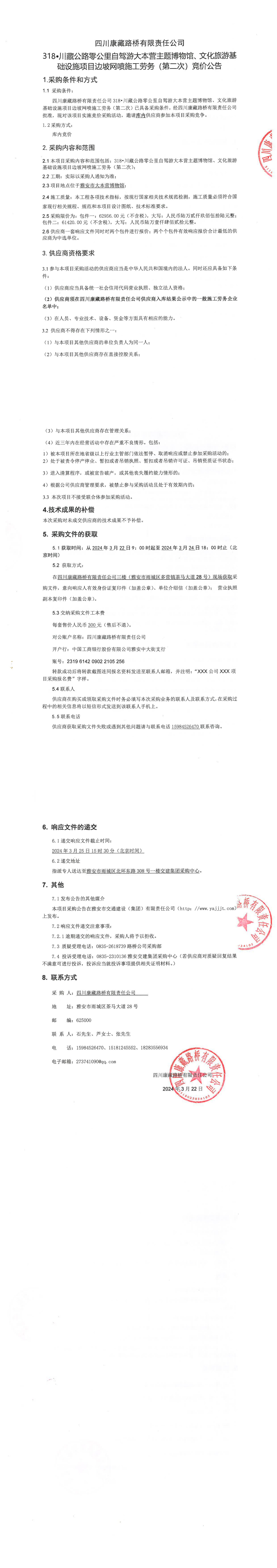 四川康藏路橋有限責(zé)任公司318·川藏公路零公里自駕游大本營主題博物館、文化旅游基礎(chǔ)設(shè)施項(xiàng)目邊坡網(wǎng)噴施工勞務(wù)(第二次)競(jìng)價(jià)公告