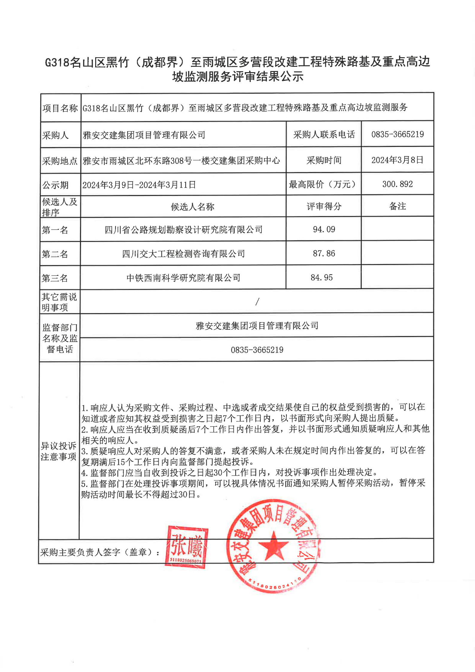 雅安交建集團(tuán)項目管理有限公司G318名山區(qū)黑竹(成度界)至雨城區(qū)多營段改建工程特殊路基及重點高邊坡監(jiān)測服務(wù)評審結(jié)果公示