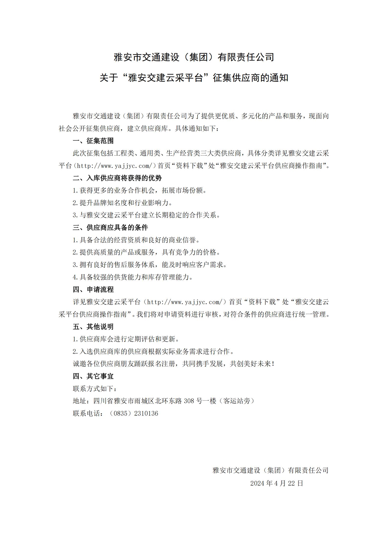 雅安市交通建設(shè)(集團)有限責任公司關(guān)于“雅安交建云采平臺”征集供應商的通知