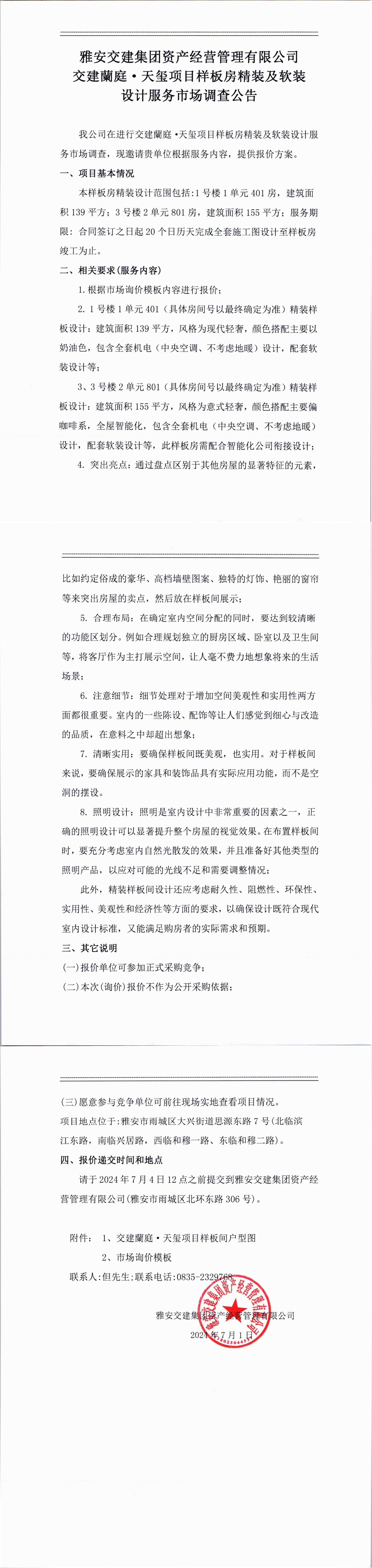 雅安交建集團資產(chǎn)經(jīng)營管理有限公司交建蘭庭·天璽項目樣板房精裝及軟裝設計服務市場調查公告