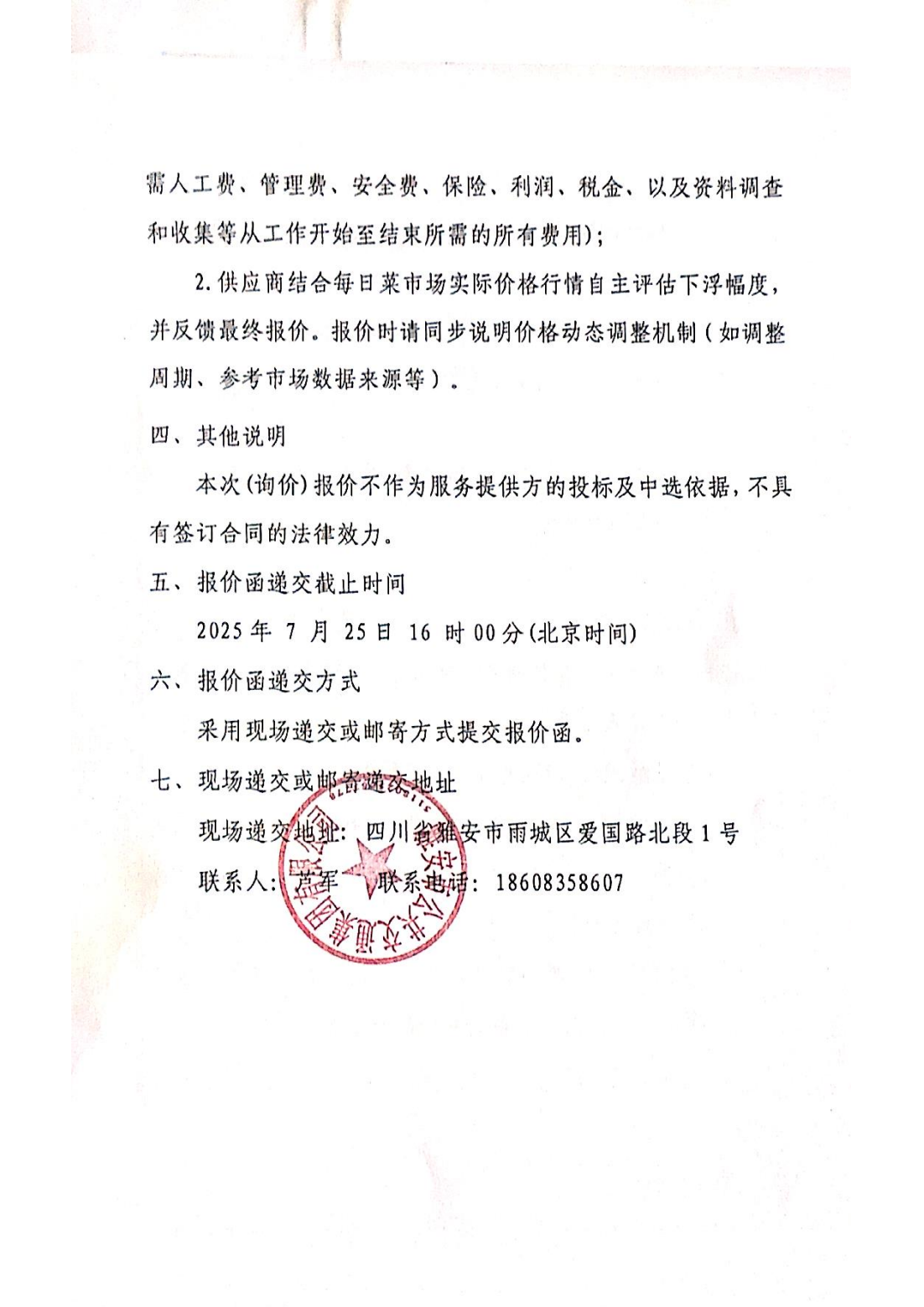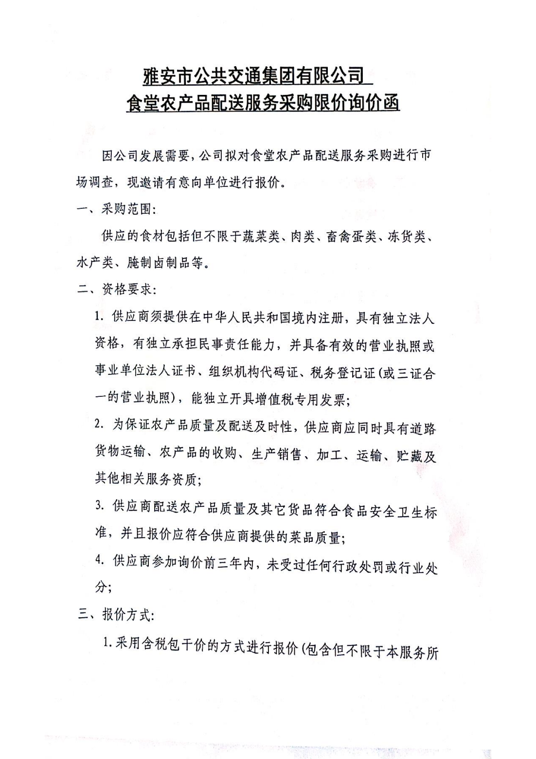 關(guān)于雅安市公共交通集團有限公司食堂農(nóng)產(chǎn)品配送服務(wù)采購限價的詢價函
