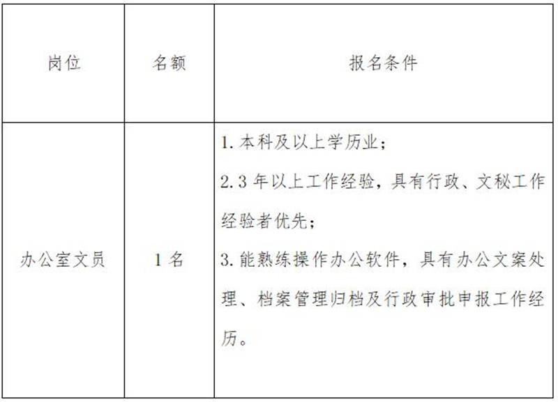 雅安交建集團(tuán)康居建設(shè)工程質(zhì)量與室內(nèi)環(huán)境污染檢測有限公司是雅安市交通建設(shè)(集團(tuán))有限責(zé)任公司下屬子公司,主要從事民用建筑室內(nèi)環(huán)境污染檢測業(yè)務(wù),F(xiàn)根據(jù)公司業(yè)務(wù)發(fā)展需要,擬向社會(huì)公開招聘1名辦公室文員,現(xiàn)將有關(guān)事項(xiàng)公告如下: