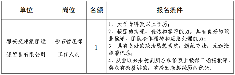雅安交建集團(tuán)關(guān)于公開招聘所屬子公司工作人員的公告(運(yùn)通公司)