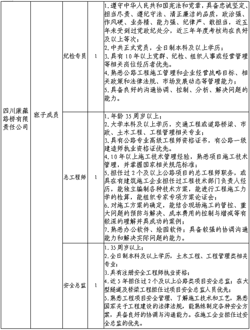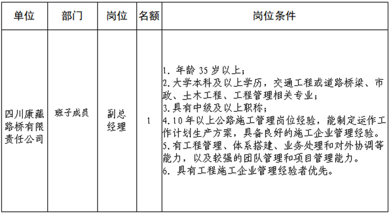 根據(jù)發(fā)展需要,決定面向社會公開招聘雅安市交通建設(shè)(集團(tuán))有限責(zé)任公司(以下簡稱“雅安交建集團(tuán)”)所屬子公司班子成4名,現(xiàn)將有關(guān)事項(xiàng)公告如下: