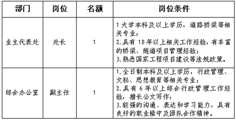 根據(jù)發(fā)展需要,決定面向社會(huì)公開招聘雅安市交通建設(shè)(集團(tuán))有限責(zé)任公司(以下簡稱“雅安交建集團(tuán)”)所屬子公司相關(guān)人員2名,現(xiàn)將有關(guān)事項(xiàng)公告如下: