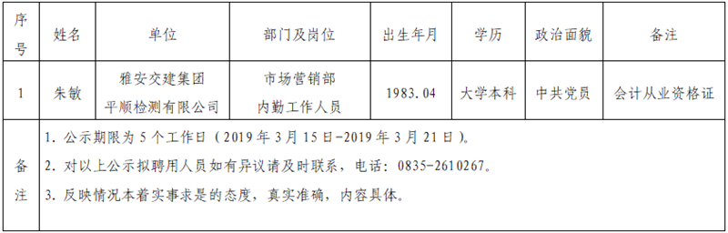 雅安交建集團子公司擬聘用人員公示(平順公司)