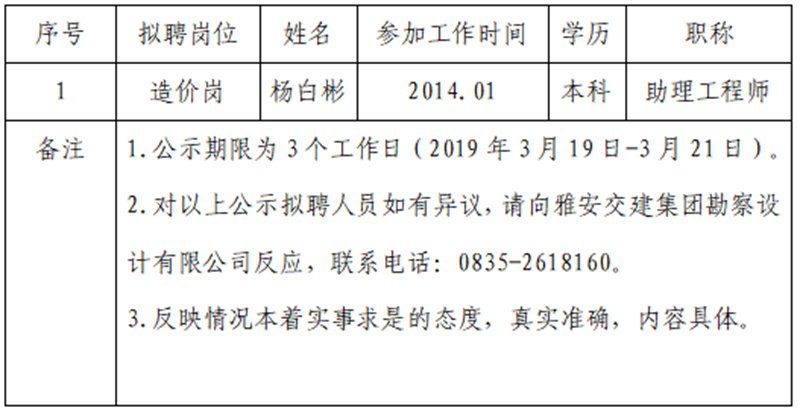 雅安交建集團勘察設計有限公司擬聘用人員公示