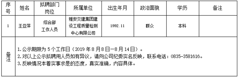 雅安交建集團子公司擬聘用人員公示(工程質量檢測中心)