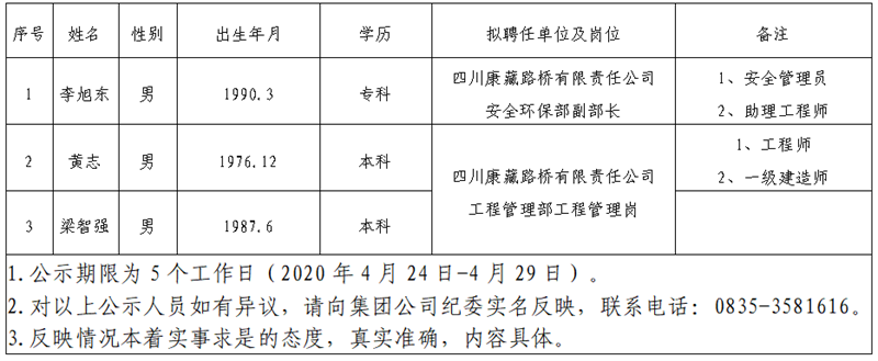 根據(jù)雅安市交通建設(shè)(集團(tuán))有限責(zé)任公司招聘公告,經(jīng)公開報名、資格初審、筆試、面試、體檢考察等環(huán)節(jié),現(xiàn)將以下3名擬聘用人員予以公示: