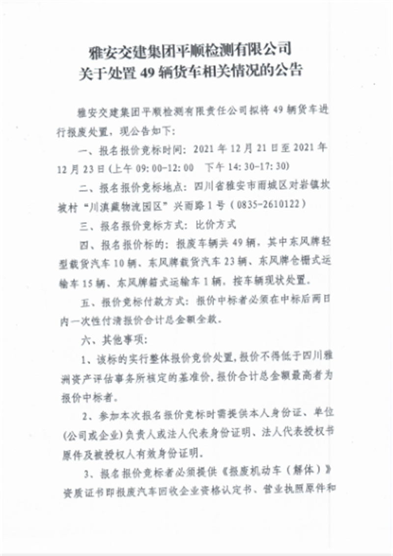 雅安交建集團(tuán)平順檢測有限公司 關(guān)于處置49輛貨車相關(guān)情況的公告