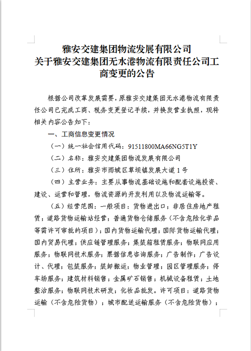 雅安交建集團(tuán)物流發(fā)展有限公司關(guān)于雅安交建集團(tuán)無(wú)水港物流有限責(zé)任公司工商變更的公告