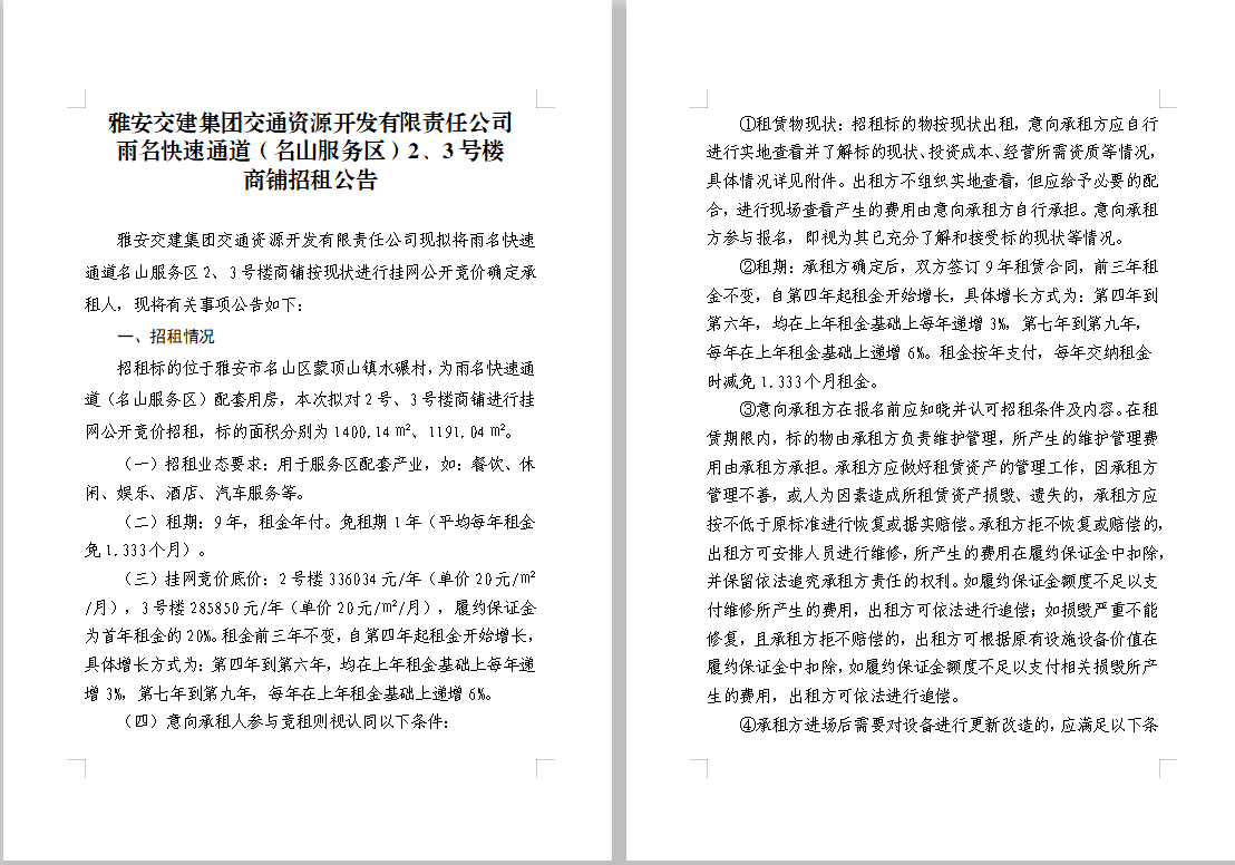 交通資源開發(fā)有限責(zé)任公司雨名快速通道(名山服務(wù)區(qū))2、3號樓商鋪招租公告