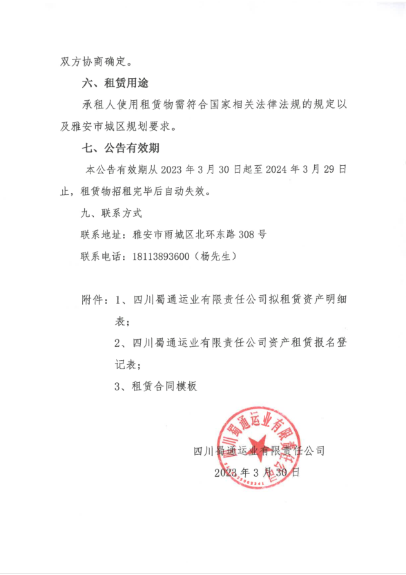 蜀通運(yùn)業(yè)有限責(zé)任公司關(guān)于閑置資產(chǎn)公開招租的公告附件