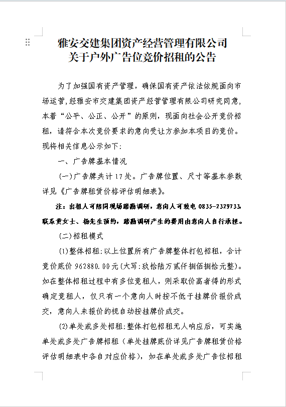 雅安交建集團(tuán)資產(chǎn)經(jīng)營(yíng)管理有限公司關(guān)于戶(hù)外廣告位競(jìng)價(jià)招租的公告