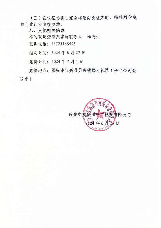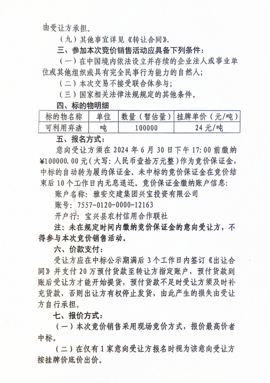 雅安交建集團(tuán)興寶投資有限公司寶興縣靈關(guān)鎮(zhèn)代碑寺土地整理項(xiàng)目10萬噸可利用棄渣競(jìng)價(jià)銷售公告(2024.6.27)