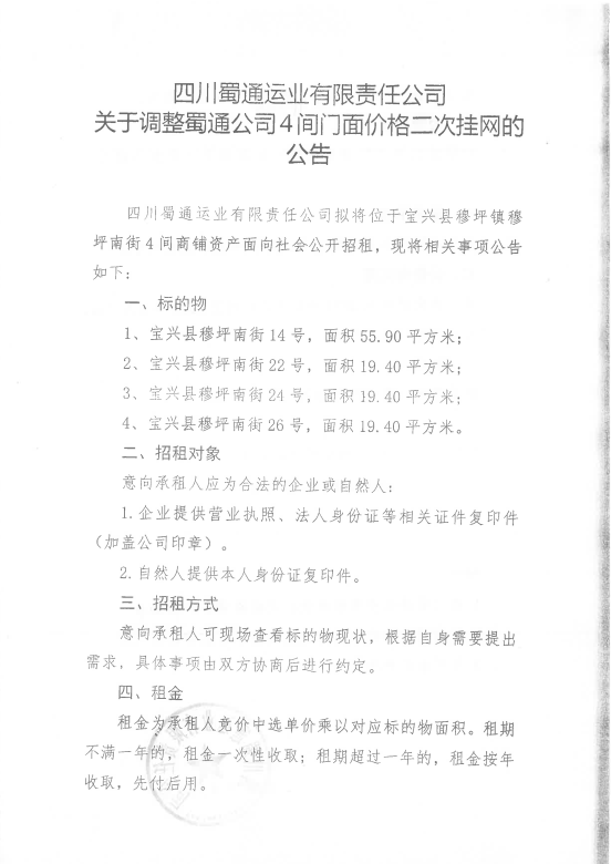 四川蜀通運(yùn)業(yè)有限責(zé)任公司關(guān)于調(diào)整蜀通公司4間門面價格二次掛網(wǎng)的公告