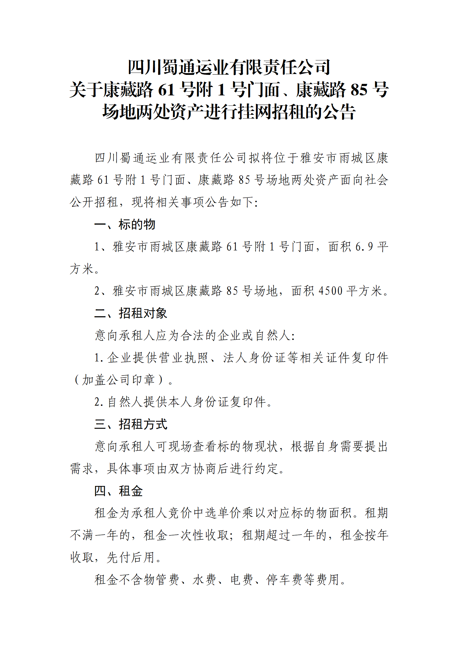 ËÄ´¨Êñͨß\˜I(y¨¨)ÓÐÏÞØŸÈι«Ë¾ êP(gu¨¡n)ÓÚ¿µ²ØÂ·61Ì–¸½1Ì–éTÃæ¡¢¿µ²ØÂ·85Ì–ˆöµØƒÉÌŽÙY®a(ch¨£n)ßMÐÐ’ì¾W(w¨£ng)ÕÐ×âµÄ¹«¸æ