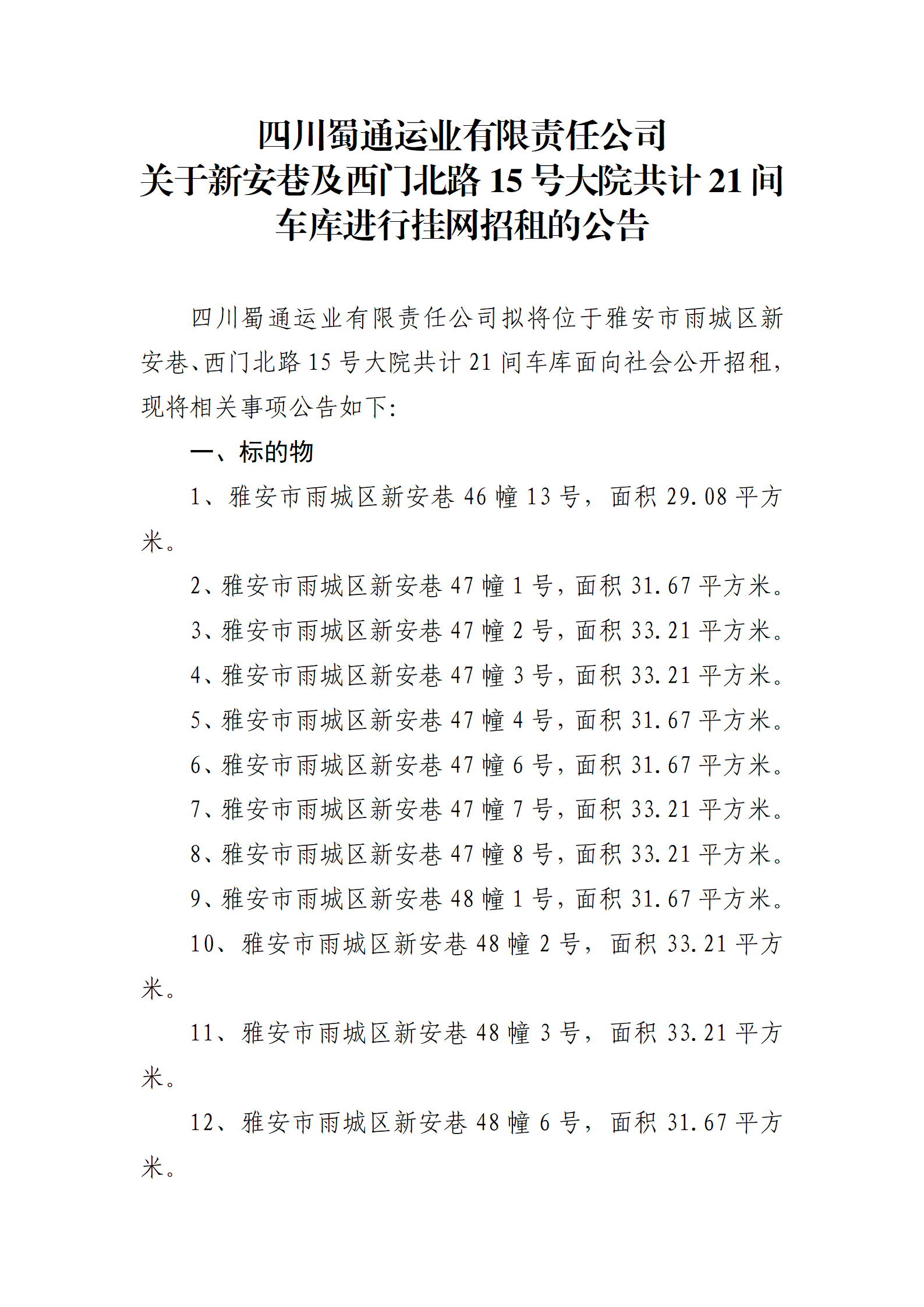 四川蜀通運業(yè)有限責任公司 關于新安巷及西門北路15號大院共計21間車庫進行掛網招租的公告