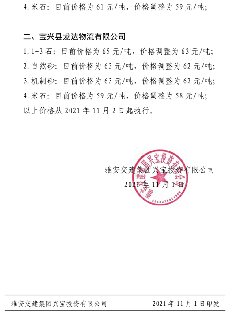 雅安交建集團(tuán)興寶公司關(guān)于調(diào)整成品料銷售價(jià)格的通知(2021.11.2)