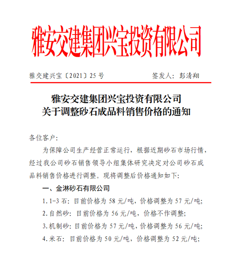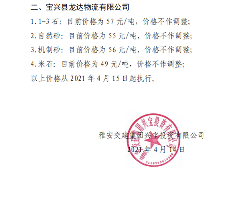 雅安交建集團興寶公司砂石骨料銷售價格情況表(2021.4.15)