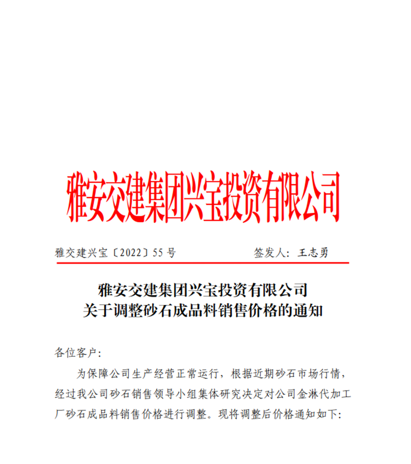 雅交建興寶〔2022〕55號 關(guān)于調(diào)整砂石成品料銷售價格的通知-11.5