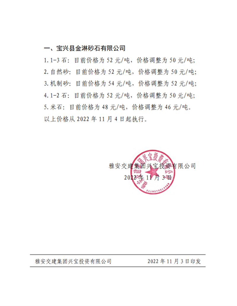 雅交建興寶〔2022〕44號 關(guān)于調(diào)整砂石成品料銷售價格的通知10.17