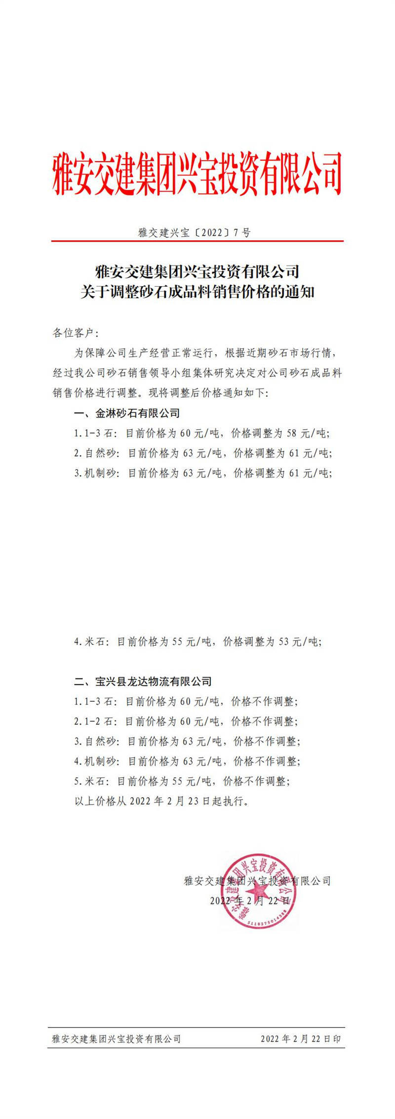 雅安交建集團(tuán)興寶投資有限公司 關(guān)于調(diào)整砂石成品料銷售價(jià)格的通知(2022-2-23)